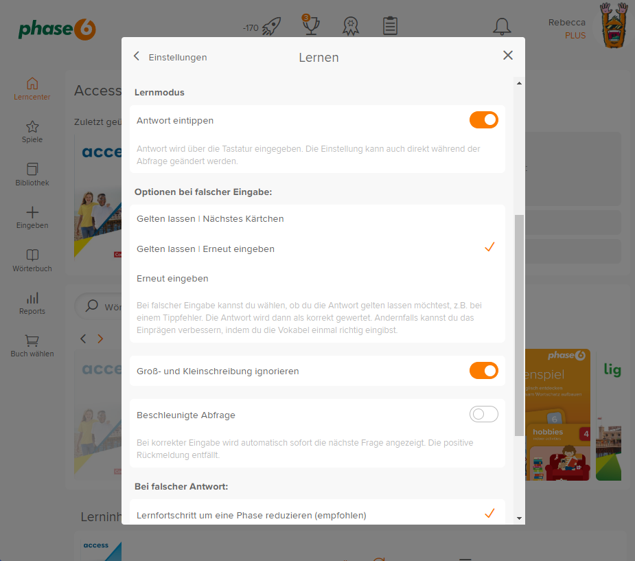 Du kannst verschiedene Einstellungen zur Vokabelabfrage anpassen und z.B. wählen, ob Antworten eingetippt werden müssen, was bei einer falschen Antwort geschieht, ob Audioinhalte automatisch abgespielt werden sollen uvm.