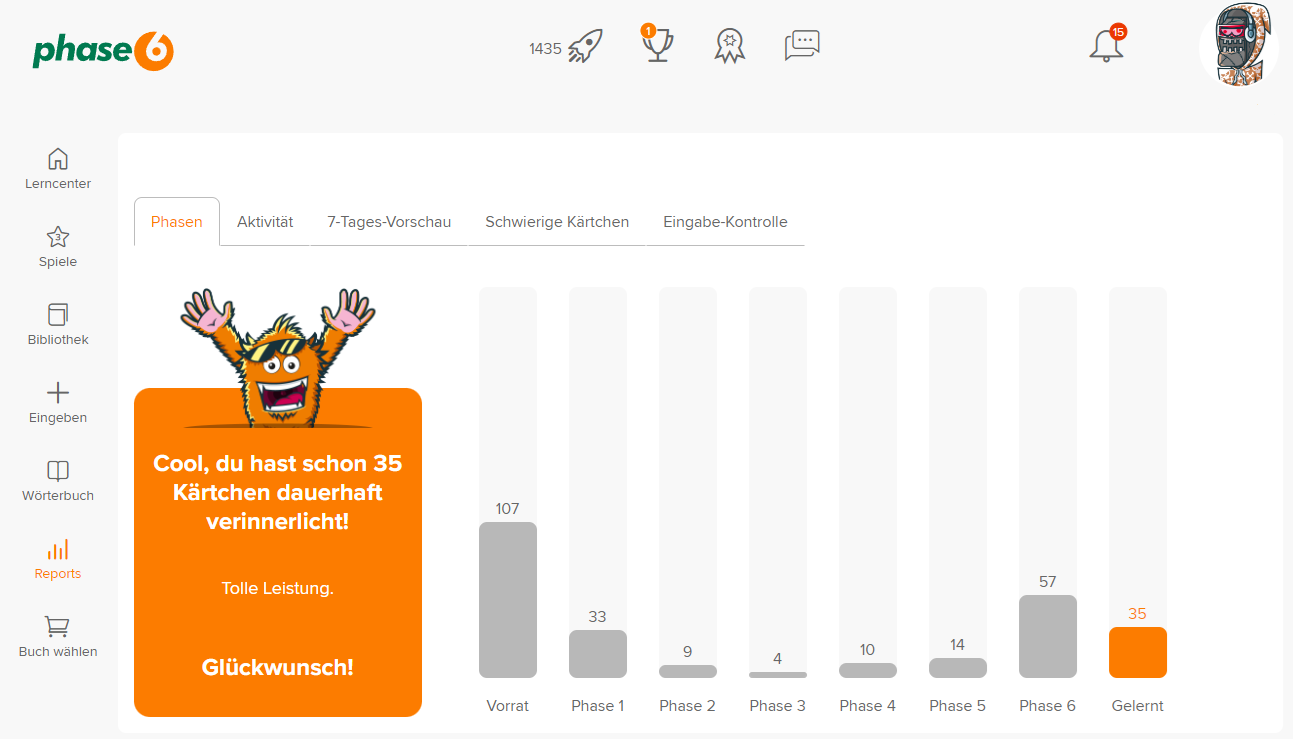 Mit phase6 trainierst du Vokabeln systematisch mit dem Ziel, sie in deinem Langzeitgedächtnis zu verankern. phase6 orientiert sich dabei an deinem persönlichen Wissensstand: Schwierige Vokabeln werden häufiger wiederholt als jene, die du schon gut kennst. Die Methode ist wissenschaftlich belegt und verbindet schnelles Lernen mit nachhaltigem Erfolg.